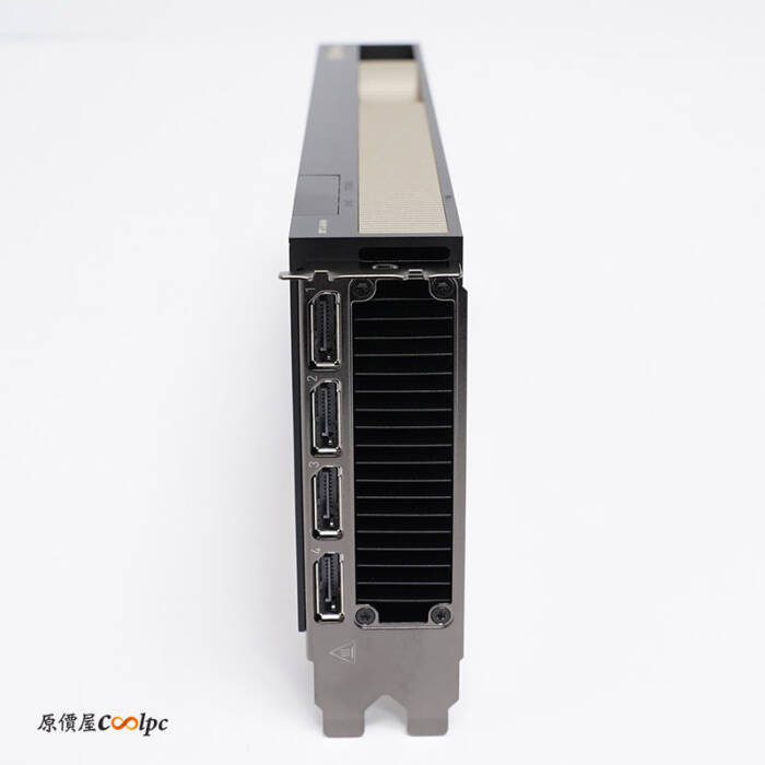 I/O提供四個DisplayPort 1.4介面,最大可輸出四個4x 4096 x 2160 @ 120 Hz 或 4x 5120 x 2880 @ 60 Hz,甚至是 2x 7680 x 4320 @ 60 Hz,都可以依照使用需求來替換解析度,旁邊的散熱鰭片則是讓後方鼓風扇,可以快速將熱源從前面帶出去。