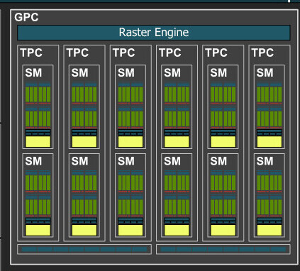 每組SMs擁有128 CUDA、4個Tensor、1個RT核心,每GPC擁有12 SMs共1536 CUDA、48個Tensor和12 個RT核心,滿血的AD102晶片具備18432 CUDA、576個Tensor與144 RT 核心,而且每組 GPC 擁有 16 RPOs,也就是說 AD102 擁有多達 192 ROPs。
