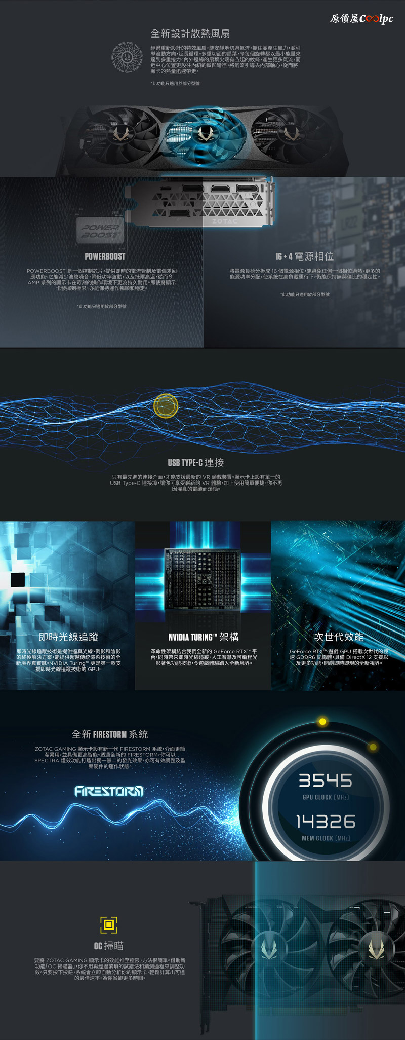 追求極致遊戲效能,要買當然要買最好的ZOTAC RTX2080Ti AMP Extreme系列顯卡啊!AMP系列顯示卡不僅用料豪華、時脈也更為驚人,還有著16+4相供電技術,確保顯示卡的超頻淺力,透過PowerBoost 控制晶片,即時監控電流管制,讓顯卡發揮到極限也能保持穩定的運作,風扇提供智能功能,玩家們可以透過Firestorm軟體設定特定情況下增加風扇轉速,讓顯示卡保持一定的溫度運作,RGB燈光時代當然不能少,風扇周圍的RGB柔光罩,都可以透過軟體更改個人喜好呈現燈效果,並且還有即時光影追蹤、AI DLSS技術加持,4K高解析度流暢遊戲體驗絕對不會讓你失望。