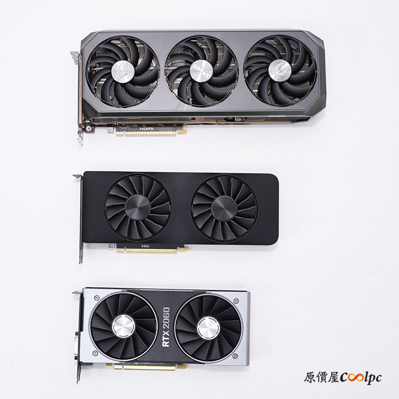 拿手上的 Intel A750 和 RTX 2060 對比一下尺寸大小,ZOTAC GeForce RTX 5080 AMP Extreme Infinity 顯卡體積是裡面最大的,所以你的機殼空間也不能挑太小啊!