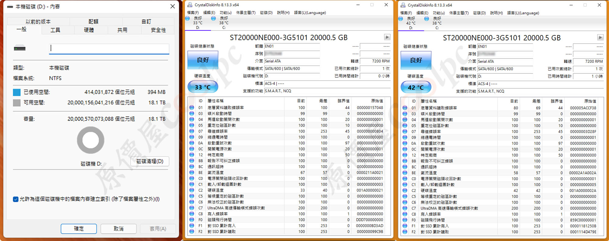 (點圖放大)開進 Windows 11 作業系統分割後,總容量大約為18.1TB,透過 CrystalDiskinfo 可判讀完整型號為 ST20000NE000-3G5101、韌體為 EN01,經過各種硬碟跑分軟體測試過,待機溫度落在 33 度,高負載時最高有達到 42 度,不過這還是裸碟沒上機的狀況下,若要裝入伺服器機殼 or NAS 設備,建議先配置完整的風扇對流系統,確保上機之後內部溫度不會過高,我曾經用 ITX 小殼來組 DIY NAS 主機,那殼的風扇只有針對 CPU,硬碟完全沒辦法主動散熱,每次看到硬碟溫度來到 60 度我都很擔心…,我後來換全漢 CST350 機殼並裝了主動散熱風扇給硬碟,硬碟溫度降了一半,現在穩穩用!