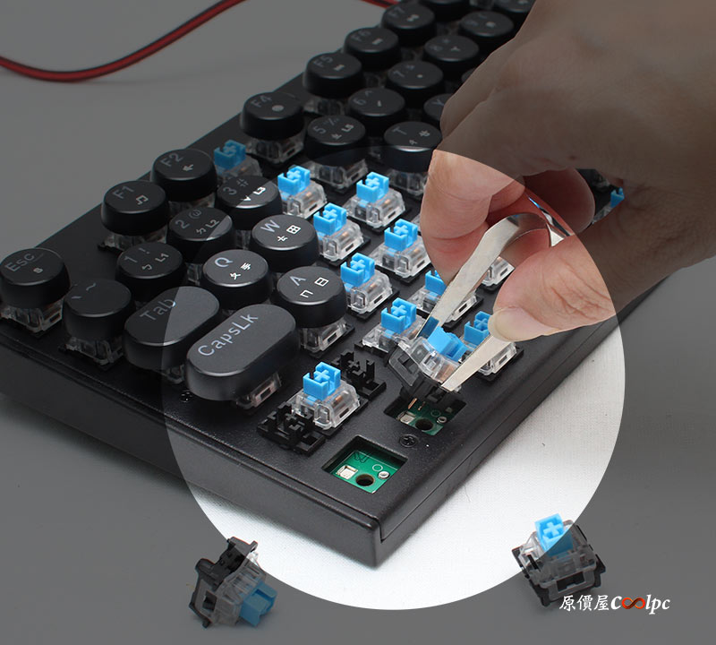 插拔軸!軸體具備防水防塵,所以飲料打翻這種意外似乎不用太擔心,而且也代表耐氧化能力應該是不錯。配件中贈送5顆裸軸以及拔軸器,不是很好拆拔(畢竟軸體穩固性比較重要!!),建議大家遇到軸體接觸不良或故障情況的時候再做更換!