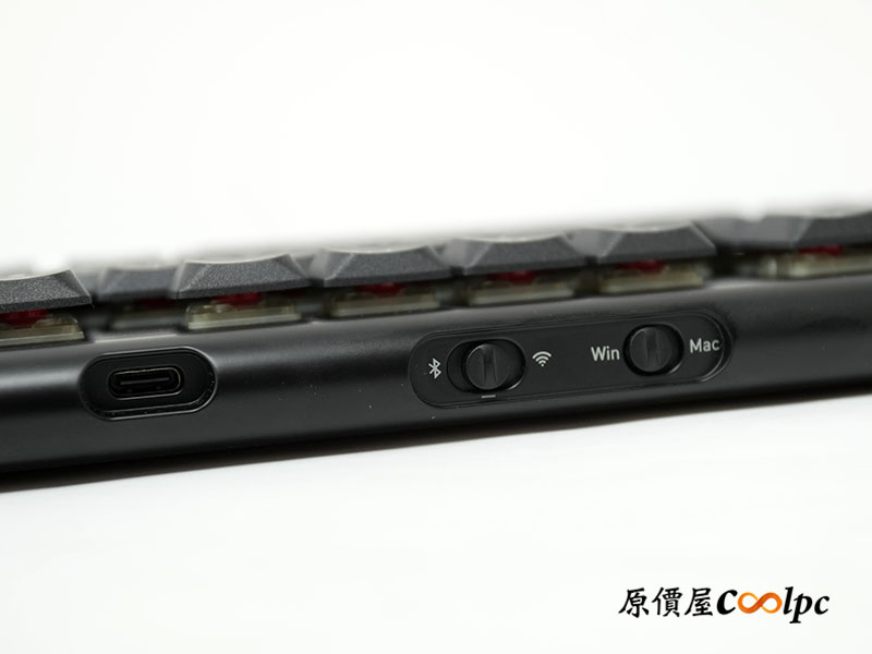 鍵盤上方是 Type-C 連接孔和兩個實體切換開關。這個 Type-C 孔有特別加大處理,方便玩家替換不同線材;兩個開關一個控制三模連線,另一個則是 Win./Mac 平台切換,操作起來直覺又簡單!