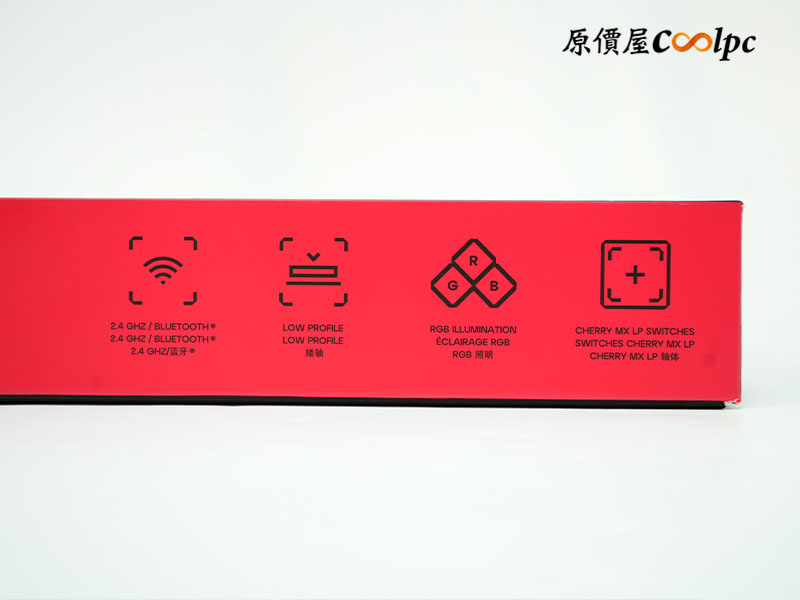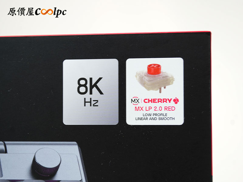 包裝維持 Cherry 辨識度超高的黑底櫻桃紅配色。外盒右上角直接標示 8K Hz 輪詢率(有線)和 MX LP 2.0 紅軸,側面則強調三模連線、矮軸、RGB 燈效等產品重點。整個外盒做得像高質感禮盒,是很貼合的硬紙盒,側邊特別設計了開孔來提升開箱體驗。