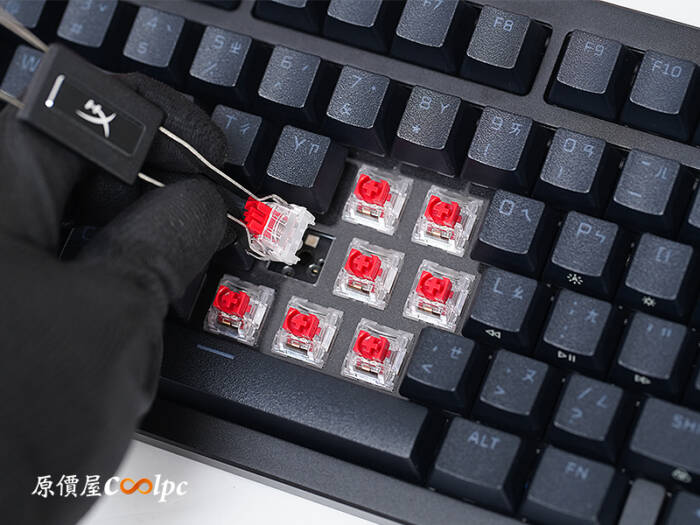 鍵盤採用熱插拔設計,支援 3 腳與 5 腳軸體,這也代表市面上 90% 軸體都能替換使用!而上面使用的軸體當然是自家 HyperX 紅軸啦!Q彈滑順的手感可是令不少玩家愛不釋手,甚至還有人只買軸用勒… 可見玩家們之間受歡迎的程度之高呢!