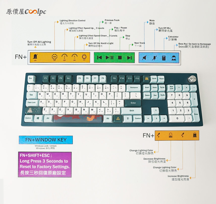 鍵盤功能很是豐富,沒有印製圖示在鍵帽上預計是不想破壞鍵盤視覺簡潔的美感。包含了燈光效果、多媒體控制、音量,還有兩個實用的小工具-計算機與老闆鍵,老闆鍵可以直接返回桌面。也可以鎖定win鍵,回復原廠設定。