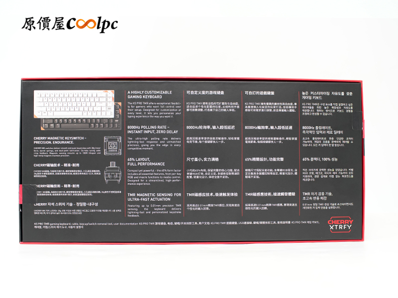 外盒延續了經典的黑紅配色,展現濃厚的 CHERRY 質感與競技風格。左上方醒目的「K5 PRO TMR」與「COMPACT」字樣,直接點出它精悍的 65% 配置;右上方印有的「8K Hz」標籤,更預告了這把鍵盤具備頂級的回報率性能。側邊也貼心地標註了 RGB 燈效、磁軸熱插拔、CHERRY MK 軸體以及自定義動態鍵程等核心規格。