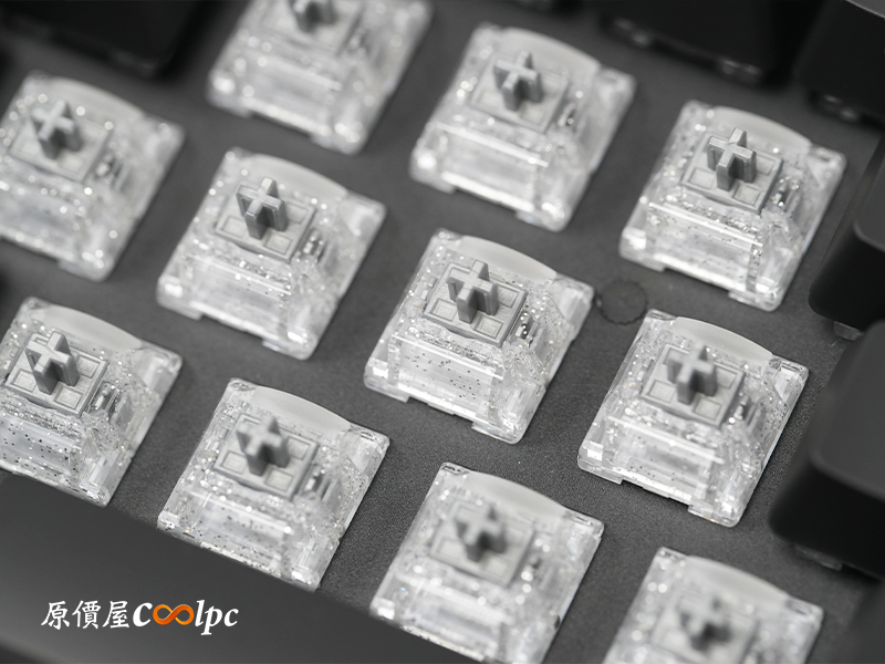 軸體搭載的是 CHERRY 自家研發的首款磁軸 MK 魔晶磁軸。全透亮且帶有閃粉效果的軸體外殼,完美呼應了它的美名,視覺效果極其別緻。手感上屬於極致輕快的線性回饋,起始壓力僅 30g,搭配 3.5mm 的總行程與 0.1mm ~ 3.3mm 的可調節範圍,反應相當靈敏。軸體旁還特別設計了導光柱來強化 RGB 擴散,完全不用擔心燈效不夠華麗。