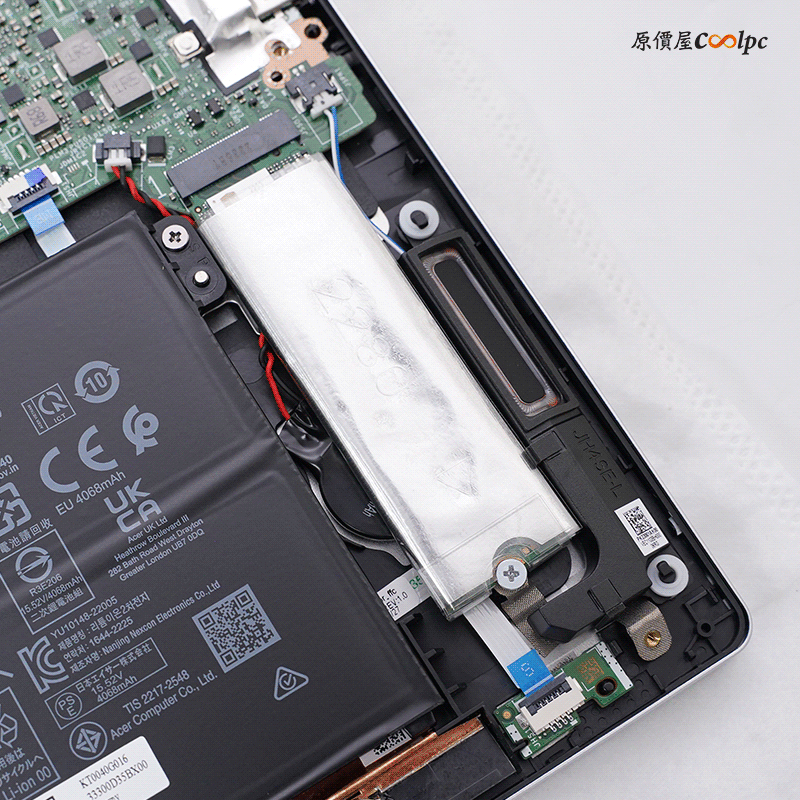 接著來看看內部用料囉!記憶體是直接焊在主機板上(16GB LPDDR5X),散熱部分採用雙風扇+雙熱導管設計,排線底下還可以再擴充一條M.2 SSD,若真要擴充建議玩家們不要自己拆,買筆電的時候告知要擴充,讓我們專業的幫你裝比較妥當!右下角的M.2有一層隔絕鋁箔包住,應該是防靜電,裡面的SSD是海力士OEM規格,網卡的部分是Intel Killer AX1675i AX211NGW Wi-Fi 6E晶片,離電池的部分額定容量為4068mAh/63.13Wh。