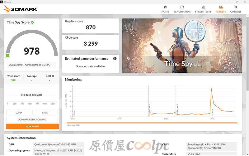 (點圖放大)CPU-Z 顯示為 Snapdragon X1 Plus X1P-42-100,採用台積電 4nm 製程製程,8(4+4) 核 8 緒,時脈為 3.2GHz,具備 45 TOPS AI 算力,符合微軟 Copilot+ PC 需求。