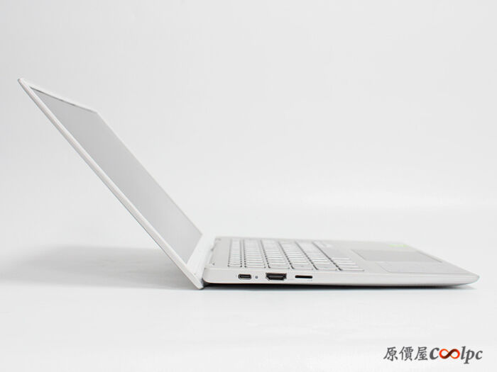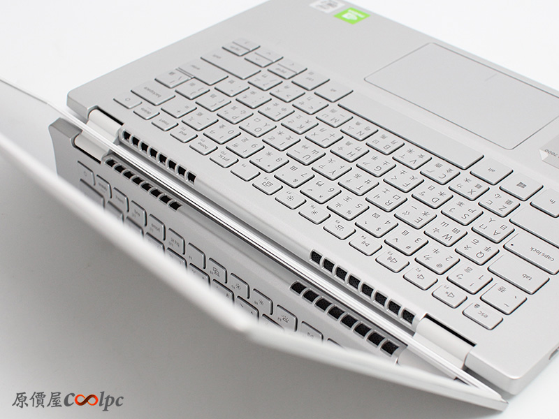 相當纖薄的機身設計,另外也可以看到螢幕掀開後下方會變成機身支架,提高鍵盤輸入的手感及散熱表現。