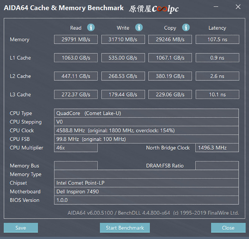 內建的LPDDR3L 2133MHz 16GB 記憶體透過AIDA64 記憶體測試,讀取速度為29791MB/s,寫入速度為31710MB/s,複製速度為29246MB/s,延遲107.5ns,但很可惜記憶體的時序偵測不出來。