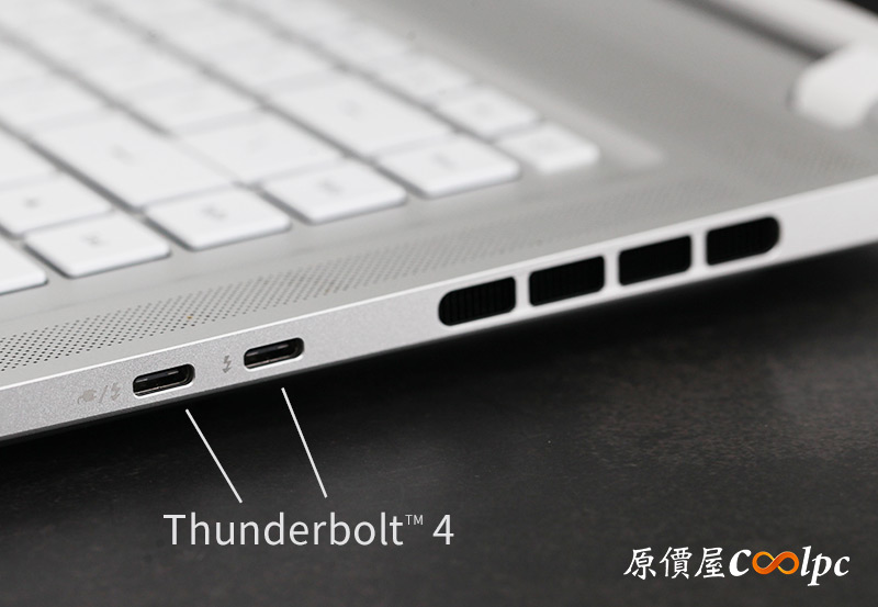 右側I/O同樣有排風散熱孔,配置兩組Thunderbolt™ 4連接埠,支援DisplayPort™顯示,左邊有插頭符號的連接埠還支援PD快充喔。