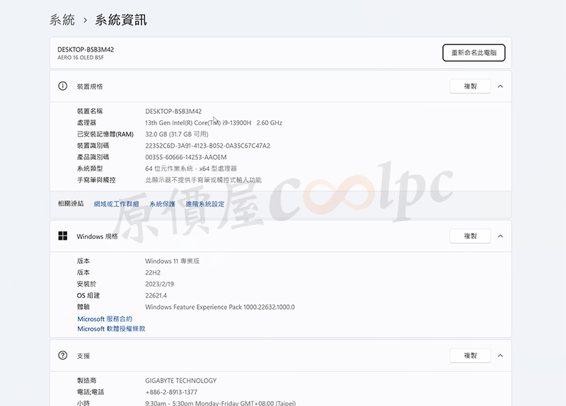 接著進到設定查看系統資訊,可以看出這台技嘉AERO 16 OLED BSF-A3TW964SP是搭載Intel 13代i9-13900H處理器,32GB DDR5記憶體,出廠預載Windows 11專業版作業系統。