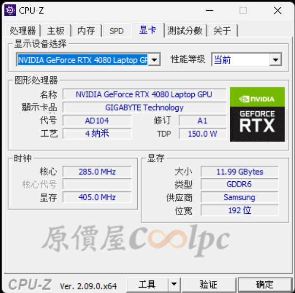 NVIDIA RTX4080 Laptop 顯示卡資訊 顯卡功耗為175W,最高時脈 2280MHz / Max。