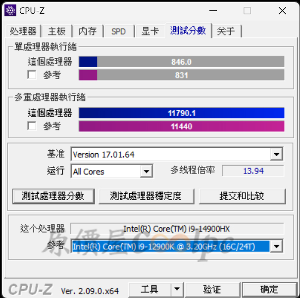 首先用 CPU-Z 驗明正身,搭載 CPU Intel Core i9-14900HX (24C/32T) 處理器以及 NVIDIA RTX4080 Laptop 顯示卡,兩隻三星 16x2GB DDR5 5600 記憶體,其 CPU 效能甚至略勝桌機版 Intel Core i9-12900K (16C/24T)。