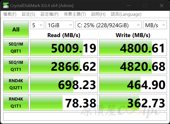 SSD測試讀:5009MB/s、寫:4800MB/s。