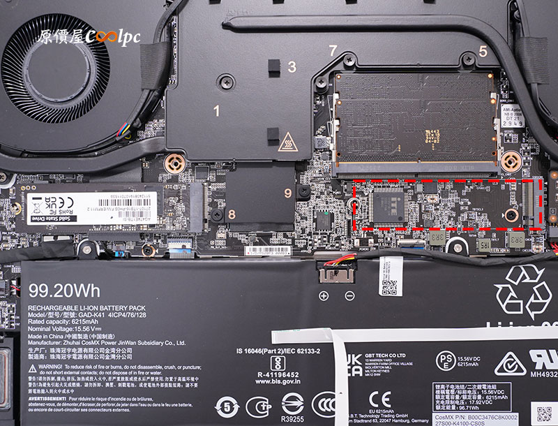 (點圖放大)接著來看看內部用料囉!提醒各位拆的時候要特別小心,背蓋有 RGB 燈條,模組化線材剛好在電池正上方,所以打開側蓋不要大力扯,等到蓋子都打開了,再轉向把模組化線材拔除。散熱系統採用均熱板大面積覆蓋 CPU、GPU 和 VRAM 元件,透過雙強力風扇,進風從鍵盤和底部進氣,透過四向出風散熱,確保效能隨時保持在高水準。M.2 部分提供兩個插槽,一個是 Gen5,一個是 Gen4 通道,最大可安裝 4TB 容量,內建技嘉AG474E 1TB 容量的 M.2 高速 SSD,兩條記憶體為單面顆粒 16GB DDR5-5600 時脈,共組成 32GB 容量,電池的部分為 99.20 Wh / 6215mAh。