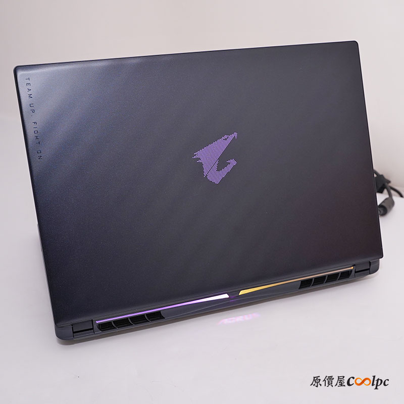 筆電外觀官方描述為暗潮黑,實際顏色是午夜藍,閃光燈打下去會看起來比較亮,實體蠻暗的,搭配上 NIL 奈米雷射技術,散發出多層次微光,並且還有可自定義的 RGB 老鷹 LOGO,背面看會像是水波的漸層效果,底下除了兩個通風孔之外,還有暗藏一個 AORUS 投射燈,稍後開機為大家展示效果。