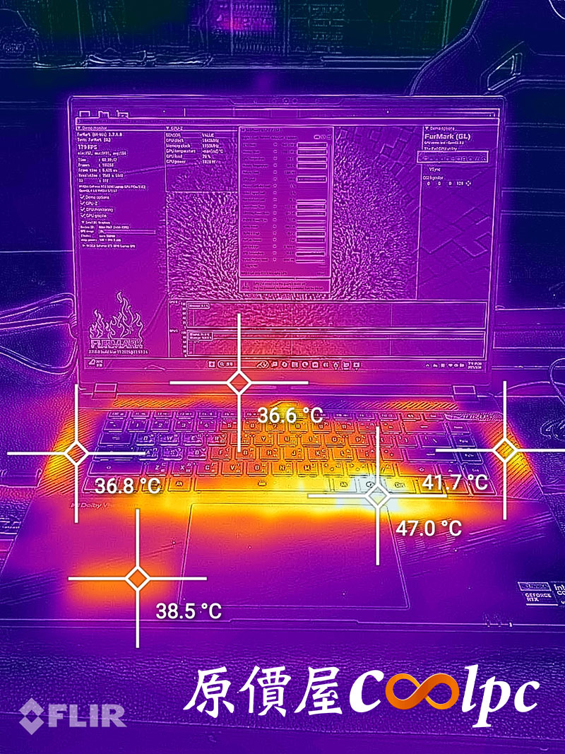 透過 FURMARK 2 顯卡滿載測試,經過約 20分鐘,最高溫度約 79.7 度,記憶體最高 94 度,整卡功號約 173.9 瓦。透過 FLIR 紅外線熱影像儀,偵測幾個溫度點,電池的地方最高 47 度,兩側出風口約 40 幾度,官網上也有提到雙強力風扇有專屬的氣流導入常用按鍵下方,從圖片上來看確實如此,鍵盤有兩個地方溫度還蠻低的,確保高效能下打遊戲不會因為熱源而影響手感。