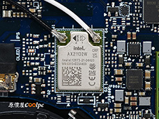 (點圖放大)機身這麼薄各位一定很好奇葫蘆裡賣什麼藥!首先映入眼簾的是那巨大的 77Whr 容量的超大片離電池,幾乎占了半台主機,兩側為通過 Dolby Vision Atmos 認證的喇叭模組,上方散熱模組使用兩根導熱管將熱量排出去,內建 Skhynix LPDDR5X 16GB 7467 MHz 記憶體(on board) ,Intel AX211D2W 網路晶片提供 Wi-Fi 6E 、藍芽 5.3 功能,Skhynix PC801 512GB Gen4 SSD,而在它的對面有提供另一組額外的擴充槽。