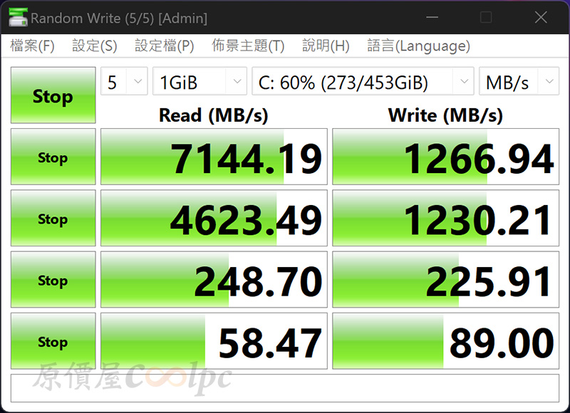 CrystalDiskMark 硬碟速度測試,最高隨機讀寫速度為 7144/1266 MB/s。