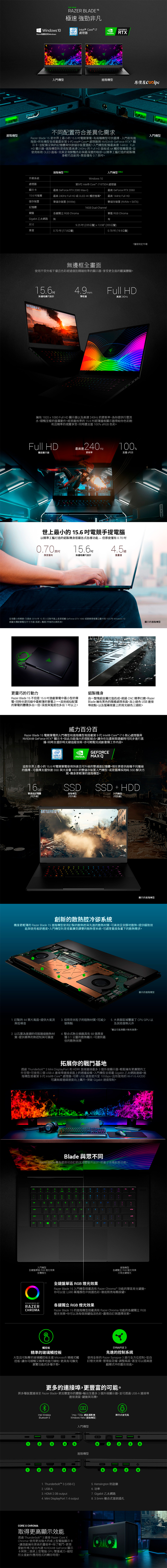 Razer Blade 15是採用Intel Core i7-9750H加NVIDIA GeForce GTX 1660 Ti 6G獨顯,所以要玩遊戲很ok,而且還有15.6” FHD 144Hz顯示器,重量也壓在約2KG,加上17.8mm的厚度,要帶出門也不致負擔過重。雷蛇Blade 15靈刃電競筆電在設計上算是比較簡約風,有人稱它是黑色的蘋果風,超薄螢幕邊框給足大視野感受,由整塊鋁金屬打造陽極處理的機身質感加乘,而頂蓋的三條蛇Logo會發出綠光更是信仰加倍!對了,它還直接內建了Thunderbolt 3 USB-C,這最高達40Gbps的頻寬為你帶來更多的可能,例如要接外接顯示卡(例如Razer CORE X/CORE V2顯示卡外接盒)達到更高遊戲效能也沒問題!