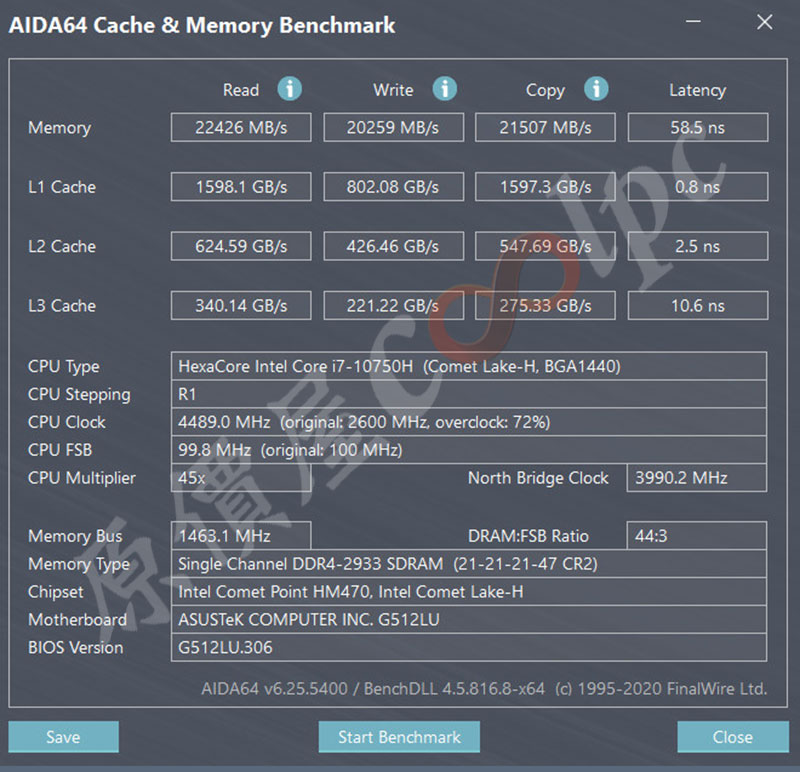 繼續使用AIDA64做記憶體測試,這次使用的記憶體為三星 8GB DDR4 2933MHz,效能模式測試結果為Read 22008MB/s、Write 20345 MB/s、Copy 20242MB/s、Latency 72.1 ns。極速模式結果為Read 22426MB/s、Write 20259 MB/s、Copy 21507MB/s、Latency 58.5 ns。三種模式的各項數據皆相去不遠,唯獨延遲的部分在極速模式下有明顯下降,整體來看還是極速>效能>靜音。(靜音與效能模式在記憶體表現上沒有明顯差異,所以僅列出效能模式數據)