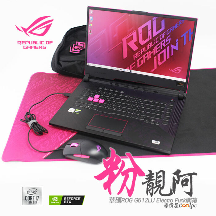 @2020/07/26 ,11:40前陣子推出的華碩西風之神筆電,在玩家間討論得沸沸揚揚,可謂話題性十足。而今天我們收到的這台也是由華碩推出,雖然沒有酷炫的動態LED面板,但絕對可以讓玩家們的少女心炸裂,有請華碩 ROG STRIX G512LU電競筆電。話說電競筆電滿街都是,這台G512LU又有什麼特別的? 答案是因為它的顏色:電馭粉。此外,它的性能當然也是非常優秀,搭載intel i7 10750H處理器(6核/12緒),內建8GB DDR4 2933記憶體、512G intel M.2 SSD,顯卡使用NVIDIA GTX 1660Ti,以筆電的規格來說已經是中上等級的打手了,更何況它還搭載15.6吋IPS面板螢幕,解析度達到FHD 1920X1080,刷新率144Hz。無論外觀或是性能都非常強大,當然還有很多出色的細節,要等到開箱之後才能讓各位知道,如果想進一步認識這台G512LU電馭粉,那你一定不能錯過今天的精采開箱。不多說,咱們直接進到開箱內容吧!