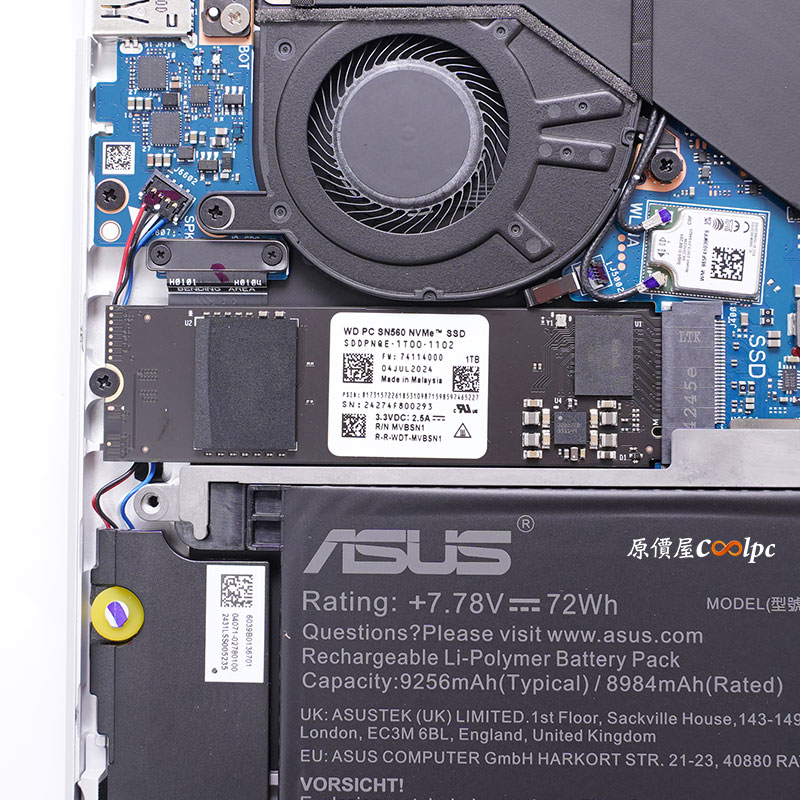 接著就是看看內部的用料啦!打開被蓋可以看到,這台筆電的電池居然佔了一半的面積,太誇張了!散熱部分採用雙風扇設計,配上雙層石墨片和超薄均溫板,滿載下也能維持在 28W TDP;內建 M.2 PCIe SSD 型號是 WD PC SN550 1TB 容量,WI-FI 7 天線為 Intel BE201 晶片,也是焊在主機板上;電池的部分搭載 72Wh 容量離電池組合。是不是覺得奇怪為什麼沒有看到記憶體擴充介面,因為 Intel Core Ultra 二代處理器把記憶體結合一起,所以沒辦法擴充,挑選機種就注定記憶體容量大小了,所以購買前記得要想一下你的用途啊!
