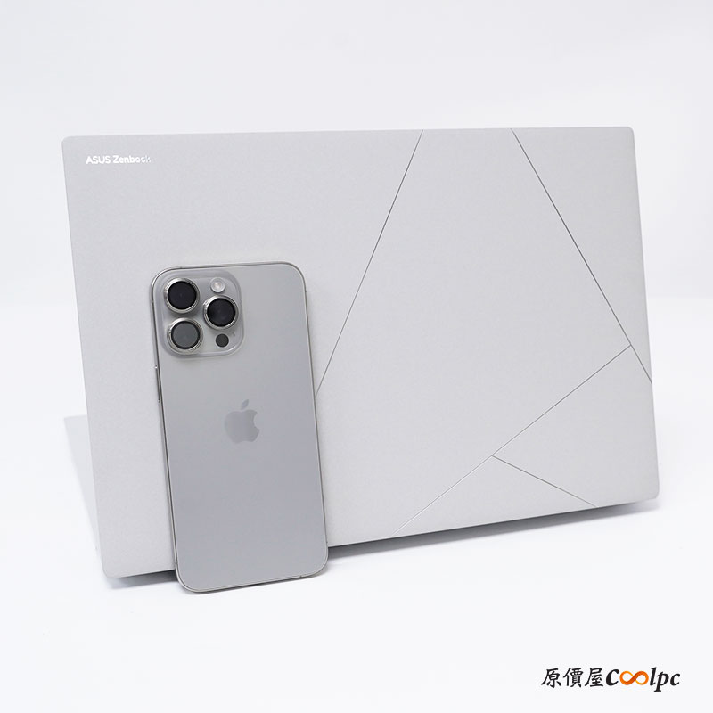 華碩 Zenbook S 14 UX5406 現身!全鋁合金設計機身,A 蓋暖煦白有點偏灰色色調,拿我手上的 IPhone 15 Pro Max 鈦原色對比一下,筆電就是比較淡的灰色。