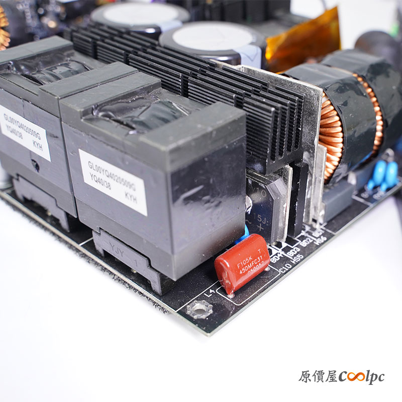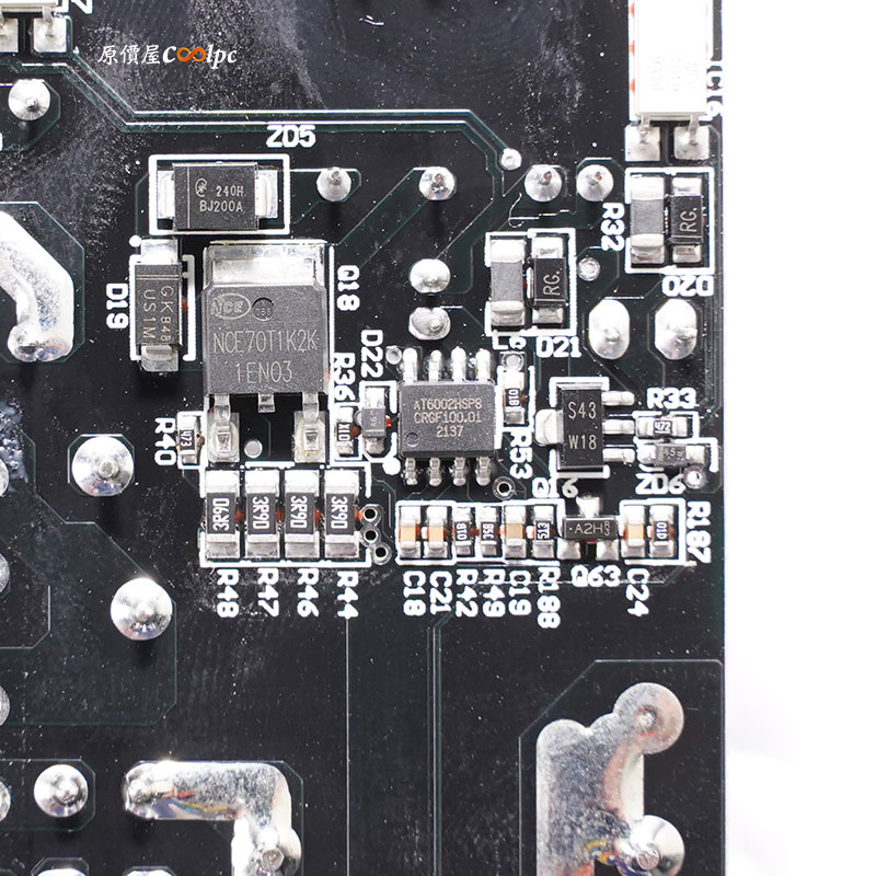 整流橋為四顆並聯設計,皆有鋁片來幫助散熱,型號為Willas GBU15J 15A 600V,兩顆PFC升壓電感為交錯式,APFC MOSFET 為兩顆 IPW60R060P7,TO-247(650V, 151A, Rds(on):0.060 Ohm)、APFC二極體 兩顆CREEC3D10060A,(600V, 10A)、APFC主控晶片APLUSTEK AT6201ZSPF,繼電器為高登GI-1A-12LHF和NTC熱敏電阻。