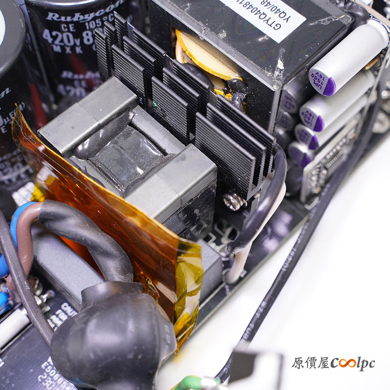 全橋LLC架構搭配同步整流,旁邊紅色薄膜電容則是濾波的用途,諧振電感、諧振電容和變壓器,四顆全橋LLC諧振轉換器MOSFET為IPA60R060P7,TO-220F (650V, 151A, Rds(on): 0.060 Ohm),LLC控制器為APLUSTEK AT6301ZSPF,變壓器兩側有十顆濾波電容,背後則是同步整流電路,有一塊鐵片來幫助散熱,同步整流MOSFET 為BSC010N04LS (40V, 281A , Rds(on): 1mOhm) 六顆並聯,共有兩組12顆。