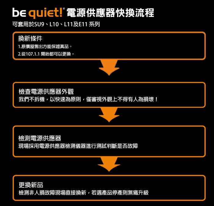 快換的四大流程分別是1.確認產品保固期限及原價屋保固標籤、2.檢查外觀是否有人損、3.透過檢測儀器判斷是否故障、4.更換新品,簡單來說只要是在民國107年1月1號起跟原價屋購買的be quiet! 電源上方有原價屋保固標籤遇到非人損故障都可以到全台原價屋be quiet! 快換中心直接換新品。