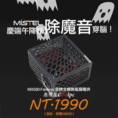 明天開始就是今年的端午連假,大家除了拜拜吃粽子、玩立蛋、看龍舟比賽、綁香包、艾草驅邪避毒外,平時對於聲音比較敏感或是需要長時間待機的朋友也可以趁著連假期間到原價屋替主機降妖除魔音穿腦!簡單來說就是去除噪音啦,說到噪音這點接受度真的因人而異,有些人感覺沒什麼也有人無法忍受,為此電腦零件當中就有不少主打靜音設計的產品希望能夠滿足追求寧靜需求的玩家選購,而今天Tin 要為大家帶來的Mistel MX550 Fanless 電源供應器就是這麼一款產品,採用無風扇設計打造最寧靜的使用體驗,原價2980元(含稅),現在慶端午限量一百顆只要1990元(含稅)!