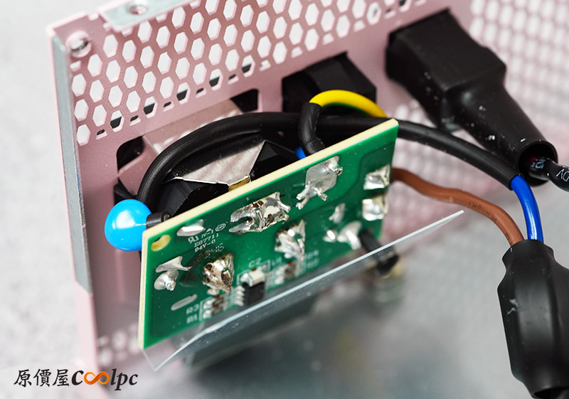 接著拆開電源上蓋,可以看到風扇有透明導流板幫助氣流集中,內建的風扇是虹華HA13525H12F-Z,使用FDB流體動力軸承,比起傳統風扇產生的噪音更小,溫度更低。運作時也能減少磨擦和震動,更有益於延長風扇使用壽命。