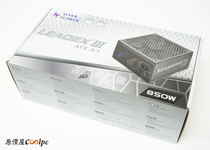 包裝維持LEADEX III系列的經典灰銀配色,有電源供應器的彩色圖照與LEADEX III字樣可以參考,不過這次的是符合ATX3.1規範,CYBENETICS/CYBENETICS 230V白金效率的版本,另外還有很多細節特色藏在封面,像是PCIe 5.1 Ready、Zero dB風扇模式、能承受200%峰值功耗等字樣。
