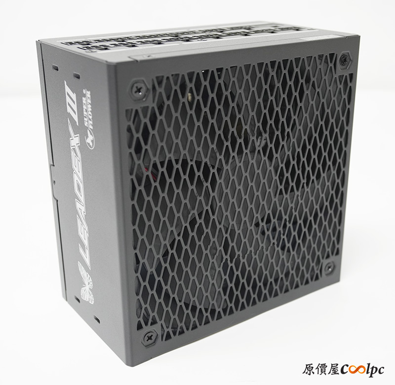 散熱搭配一顆14cm H.D.B.軸承智慧溫控靜音風扇,可以透過電源上的實體按鈕切換到ECO模式,低負載狀態會自動停轉減少噪音,電源外殼上有密集的幾何外殼散熱孔,氣流進出基本上暢行無阻。