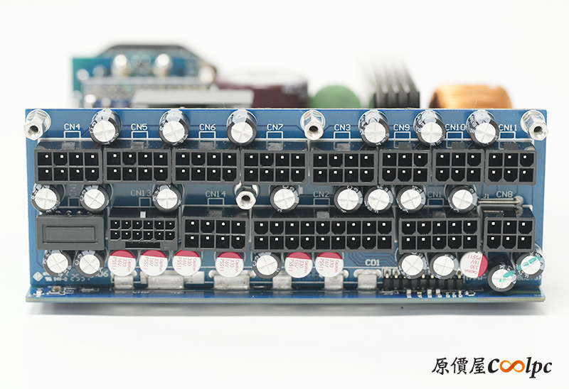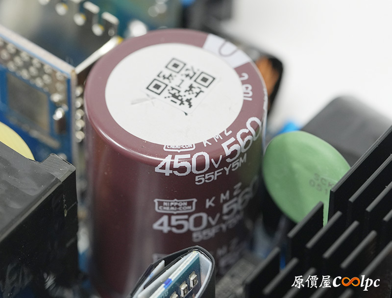 直接看模組化輸出端這邊,插槽功能都有標示加上防呆設計,看得出來12V-2×6有預留一個插槽空間,但猜測是因為這顆LEADEX III最多就850W輸出,多做也不會真的讓總輸出上升,看來只有更大瓦數的版本有機會用上它了。