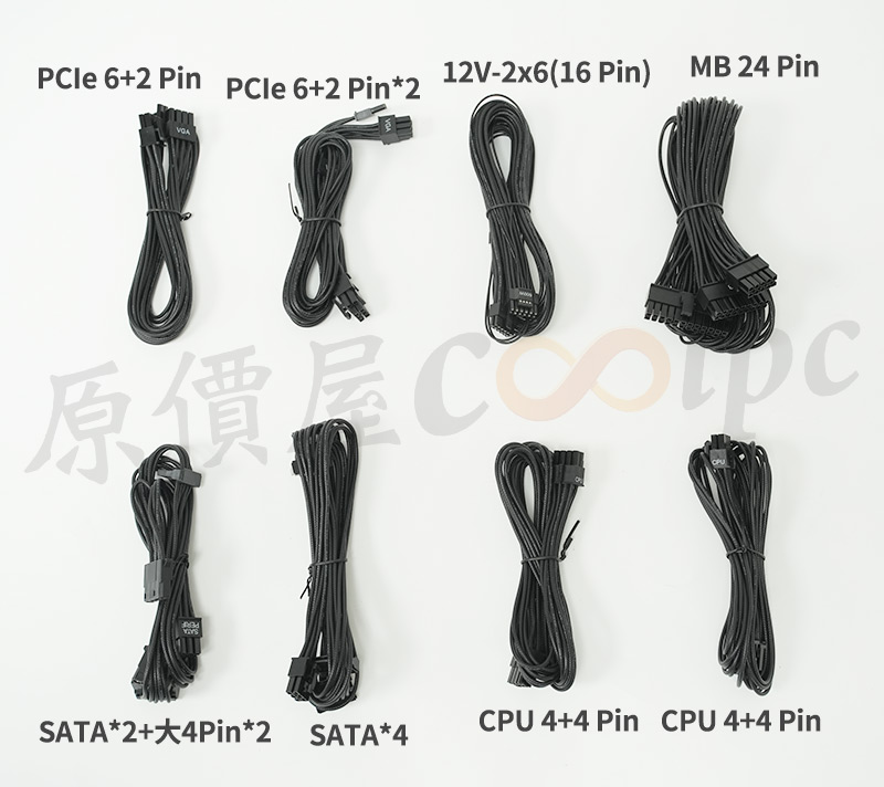 模組化線材有MB 24Pin、顯卡12V-2×6、顯卡PCIe 6+2Pin*2、顯卡PCIe 6+2Pin、CPU 4+4Pin、SATA*4、SATA*2+大4Pin*2。比較意外的是PCIe 6+2Pin與SATA電源的部分數量相對少,不過大多數情況都還是夠用,建議玩家們在選購零件的時候特別留意一下。