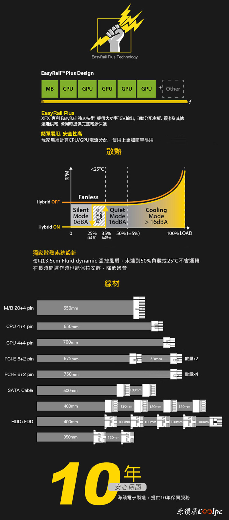 此外前面提到這兩顆電源供應器還有十年海韻保固,因為這兩顆電源供應器就是XFX 委託海韻代工的,以海韻PRIME 鈦金牌電源供應器為基礎打造,通過80Plus 鈦金牌認證,擁有高達94% 的電源轉換效率,支援XFX 專利EasyRial Plus 大功率12V 輸出技術,內部採用主動式PFC、LLC 全橋諧振、DC-DC架構並採用全日系電解電容確保供電水準,散熱部分搭載Hybrid Fan Control 靜音模式搭配13.5cm Fluid Dynamic 溫控風扇,能夠設定電源供應器負載低於50% 或25%時停止運作保持靜音,供電保護上則提供包含OCP 過電流、OTP 過熱、OVP 過電壓、UVP 低電壓、OPP 過載及SCP 短路等保護設計,線材部分則具備全模組化設計方便整線,接頭部分也擁有CPU 雙8Pin 設計確保高階CPU 供電穩定,而在PCI-E 供電部分提供了多達8個6+2Pin 接頭,最高能夠支援到4Way NVIDIA SLI 或AMD CrossFireX 顯示卡串聯加速,以這等規格來看市面上同級產品售價都在8~9千左右,這次XFX XTi 850W 僅要7590元(含稅),XTi 1000W 則為8990元(含稅),算是相對划算更何況這次還要分別送上價值2990元及3990元的機殼,算下來電源供應器部分大概只要五千元,這種價格這種規格可以說是在高端電供市場橫掃千軍!因此有興趣的朋友別再猶豫啦,總數就這麼70組,現在就快到全台原價屋門市(詳情)或透過線上估價系統第14大項機殼專區(詳情)下單訂購吧!