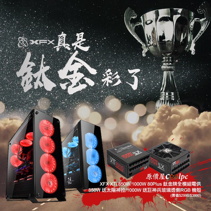現在Intel 與AMD 的核心之戰打得火熱,新產品除了比拚時脈更比核心數加上主機板的超頻設計越來越簡單,華碩甚至推出了具備AI智慧超頻的主機板,因此對高階玩家來說要發揮硬體效能的難度也越來越低,不過對這些高階產品就算發揮潛力的難度降低,但在供電品質的要求上可是一點也不減,因此有打算攻頂一台頂級電競平台的朋友,入手一顆大瓦數、高品質、保固給力的電源供應器可是重中之重,而這次原價屋就要為大家帶來XFX 新推出的鈦金牌XTi 850W、XTi 1000W 全模組化電源供應器促銷,買XTi 850W 限量送價值2990元的SADES 太陽神拉機殼,買XTi 1000W 則限量送價值3990元的SADES 巨神兵機殼,兩款機殼都具備時下流行的RGB 與玻璃透側設計,有興趣的朋友可要把握機會啦!