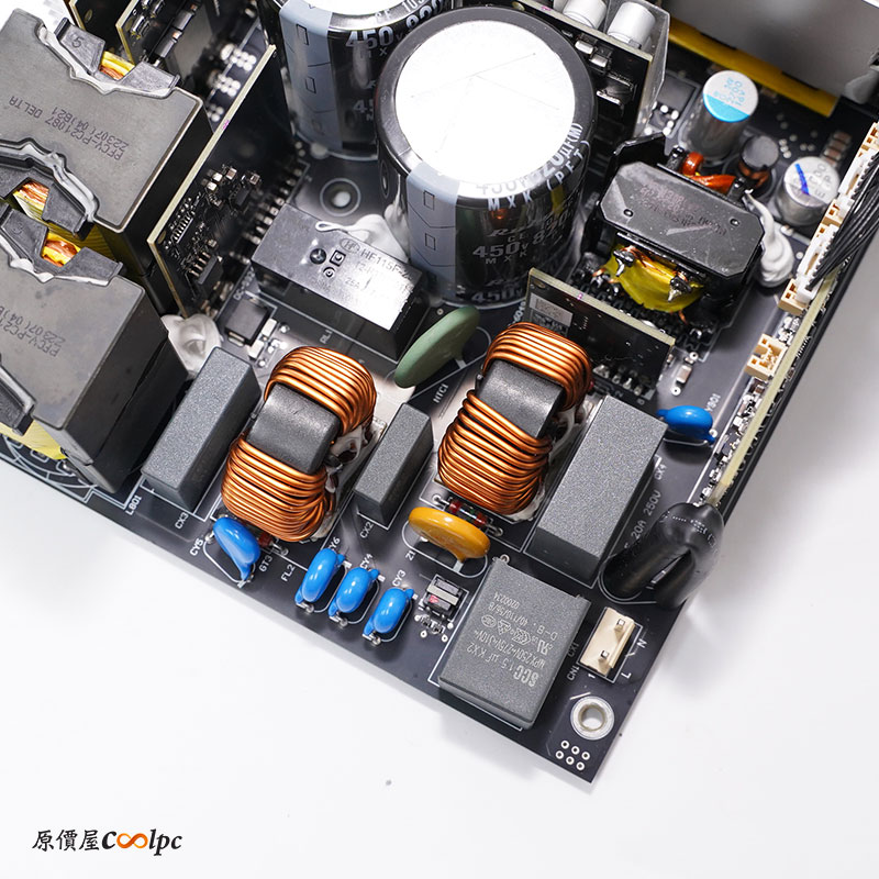 內部架後也和先前的不太一樣!採用交錯式圖騰柱拓樸電路 + 專利平面變壓器和GaN 氮化鎵HEMT組合,會比常見橋式整流器的效率更好!加上損耗也低不用散熱器也能提供高功率的轉換效率。
