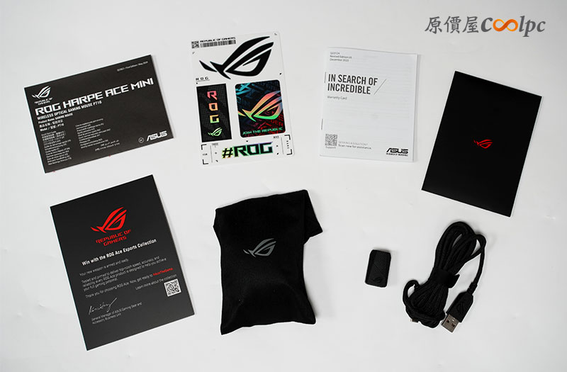 所有的內容物配件。滑鼠本體有用絨布袋保護裝載,另外還有說明手冊以及 ROG 貼紙,也有連接線和轉接頭配件。