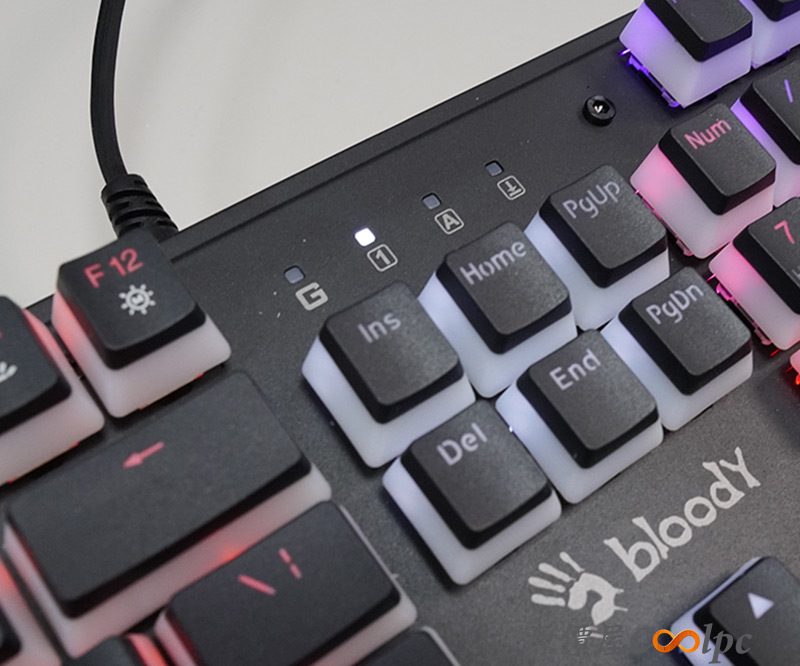滾輪中央提供燈光,在不同設定中就可以利用燈光顏色來辨識。後方則是 bloody血手系列的招牌 1,n,3, 按鍵。