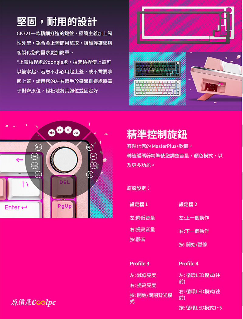 這回酷碼提前一周帶來母親節獻禮,那就在勞動節犒賞犒賞自己的辛勤好像也不錯咧!媽媽很潮的話那這整組櫻花粉鍵盤/滑鼠/鼠墊倒也很合適送給她,拿來辦公、打字、放在店面裡有2.4G也有藍牙雙模無線可方便與筆電相連,而因為 CK721 是65%小鍵盤擁有專注的完整鍵字區、方向鍵、延伸額外3鍵(也是切換三藍牙裝置的快速鍵),再加入畫龍點睛的4種功能旋鈕。那這樣的鍵位尤其適合給小筆電外接大螢幕所搭配的鍵盤使用最為有效率。迷你鍵盤與滑鼠可縮短雙手距離,有效減緩長時間使用的疲憊。CK721 也完整支援 Windows/Mac 雙系統使用呢!當然在遊戲上使用 65% 機械式鍵盤早已經瘋迷玩家界好一陣子,無多餘鍵可提升專注力、擺位自由、滑鼠空間闊綽對於甩槍轉身等動作更為靈敏操控,還方便帶去Lanparty呢!藍牙可配對3個裝置,拿來對接智慧型電視、平板手機也相當好用!
