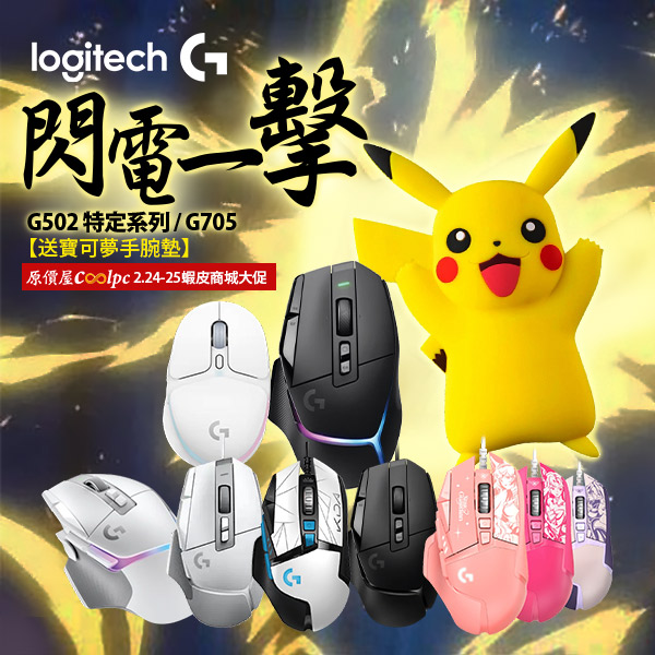除了最頂級的 G502 X PLUS 之外,本次贈送皮卡丘手靠墊的活動還加入 G502 X 同樣是最新的有線版本,當前最夯的則是英雄聯盟聯名款的 K/DA依芙琳/阿璃/凱莎/阿卡莉版本!同時還特別加入一款當前最美的白色無線新品G705 ,超輕量化的唷,擁有LIGHTSPEED+藍牙連線,小巧又精美,魅力十足!別忘了,2/24 原價屋蝦皮商城超級品牌日,2/25則是大促日,領券都可以再折價!
