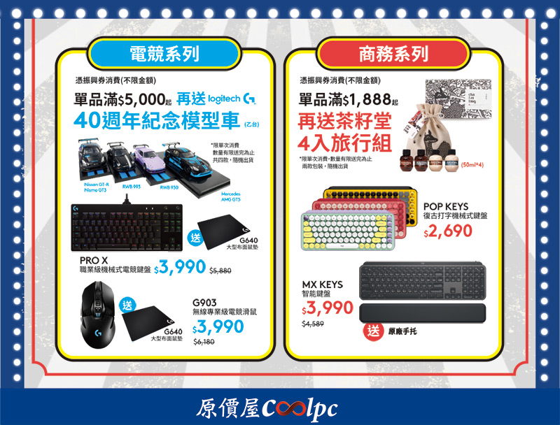 憑振興券消費羅技電競系列滿$5000贈紀念模型車乙個(款式隨機,限單筆消費不累加)