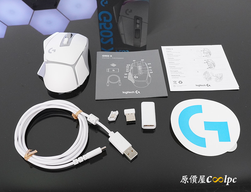 真好!白色的 G502 X PLUS 提供的是白色的線材與轉接器!