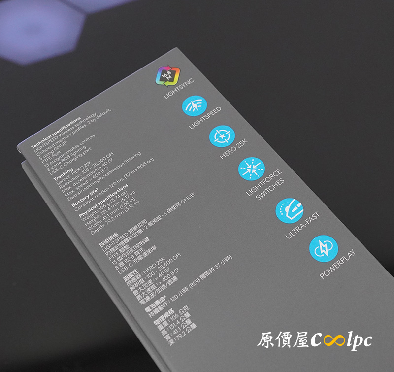 盒子側面的一排重點是LIGHTSPEED無線技術、HERO 25K感應器、LIGHTFORCE SWITCHES 複合式光微動開關、ULTRA-FAST飛梭滾輪、POWERPLAY邊玩邊充電無線技術。